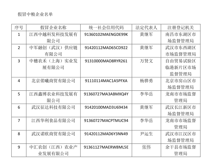 近期,,,,,,,,我司发明有不法主体以[江西中越科发科技生长有限公司]及其子公司[中军融创(武汉)供应链有限公司]、[中穗农禾(上海)实业生长有限公司]、[北京偌曦商贸有限公司]、关联企业[江西鑫博农业科技生长有限公司]、[武汉征达科技有限公司]、[江西华利食物有限公司]、[武汉诺欧商贸有限公司]、[中汇农创(江西)农业工业生长有限公司](详见附件)冒充我司([宁夏壹信投资有限公司])名义开展相关商业运动,,,,,,,,此行为已对我司声誉及正当权益造成严重损害。。。。。。。。